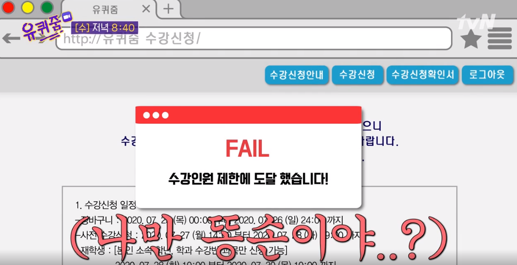 유퀴즈 온더블럭 114회 각 대학교 마다 꼭 듣고 싶은 강의가 있습니다. 인터넷으로 수강신청을 해야 하는데 빨리눌러도 안되고 늦게 눌러서도 안되고 꼭 정확하게 9시 클릭을 해야 하는 광클수업